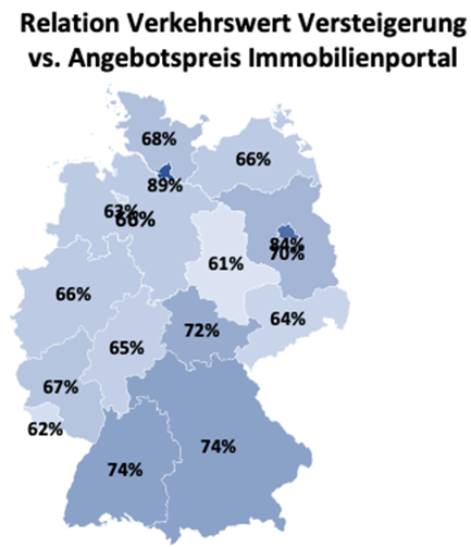 - In Flächenregionen unterscheiden sich Preise in Zwangsversteigerungen und der allgemeine Markt erheblich. Die Abschläge liegen zwischen 42% und 84%.